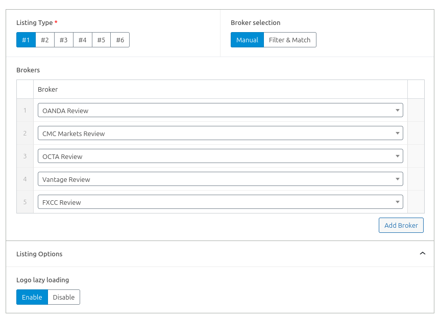 بالنسبة إلى قائمة الوسطاء – النمط رقم 1، ما عليك سوى اختيار الوسطاء، وتحديد ما إذا كنت تريد تحميل شعارات الوسطاء بشكل مؤجل أم لا. لا توجد خيارات إضافية أو أي تكوينات أخرى مطلوبة لهذا النمط من الكتل.