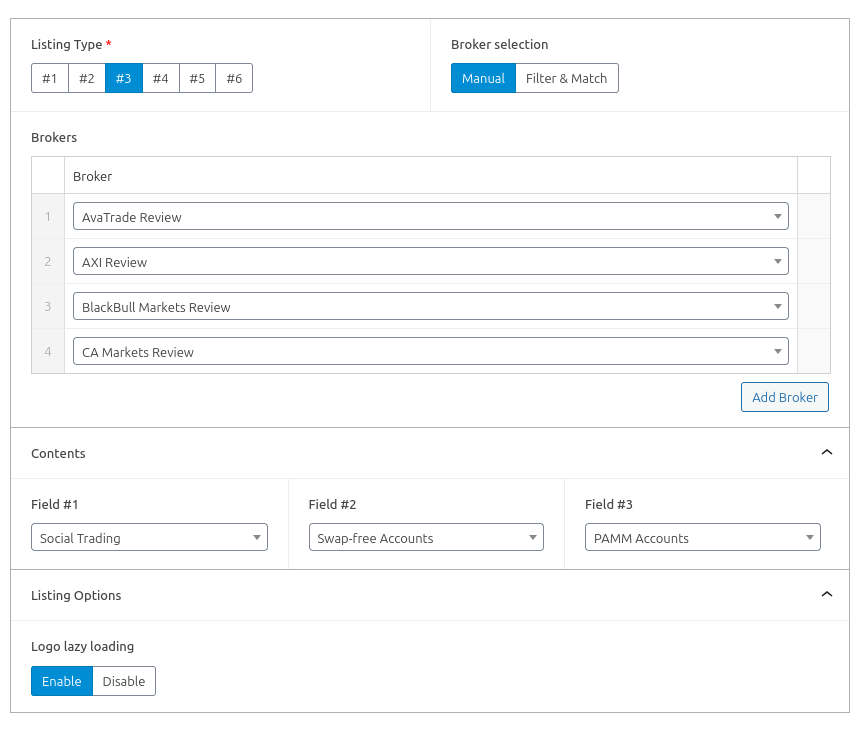 بالنسبة لقائمة الوسطاء – النمط رقم 3، عليك اختيار الوسطاء، وما إذا كنت تريد تحميل شعارات الوسطاء بشكل مؤجل أم لا، بالإضافة إلى الحقول الثلاثة لعرض المزيد من المعلومات. تشمل الحقول الحد الأدنى للإيداع ورسوم الإيداع وأدوات التداول وما إلى ذلك.